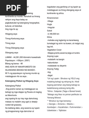 24062015 Pag-aaral ng mga katangiang pisikal kinaroroonan hugis sukatanyo vegetation cover ng daigdig pinagkukunang yaman at klima at ang aspetong pisikal ng populasyon nito anyong lupa at tubig na nakakaimpluwensiya sa pagbuo at pag-unlad ng kabihasnan ng mga Asyano at patuloy na humuhubog sa kultura at kabuhayan natin. 2 on a question. Katangiang Pisikal Ng Asya.