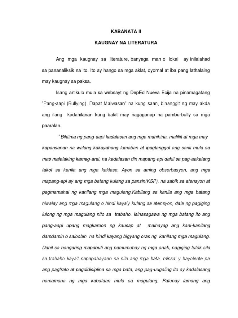 Pagsusulat ng Rebyu ng Kaugnay na Literatura HINDI koleksyon o kalipunan ng mga buod ng pag-aaal na kaparis ng iba pang pag-aaral Mga tinutukoy na. KABANATA 2 MGA KAUGNAY NA PAG-AARAL AT LITERATURA LOKAL NA LITERATURA. Depinisyon ng mga Terminolohiya Kagamitan ng Pag-aaral Ang instrumentong ginamit sa pag-aaral at pagsusuri ng mga datos ay ang talatanungan o survey questionaire na binigay sa dalawampung respondente na nakakaranas ng pambubulas o pambu-bully sa NDMI Campus.