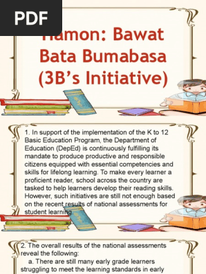 28112019 Bawat Bata Bumabasa a priority in DepEds quest for quality education PASAY CITY November 28 2019 In a move to bridge literacy gaps among learners the Department of Education DepEd is intensifying its campaign on reading proficiency with the unveiling of Hamon. Submitted by focal on Tue 12102019 - 0732. Bawat Bata Bumabasa 3Bs Initiative.