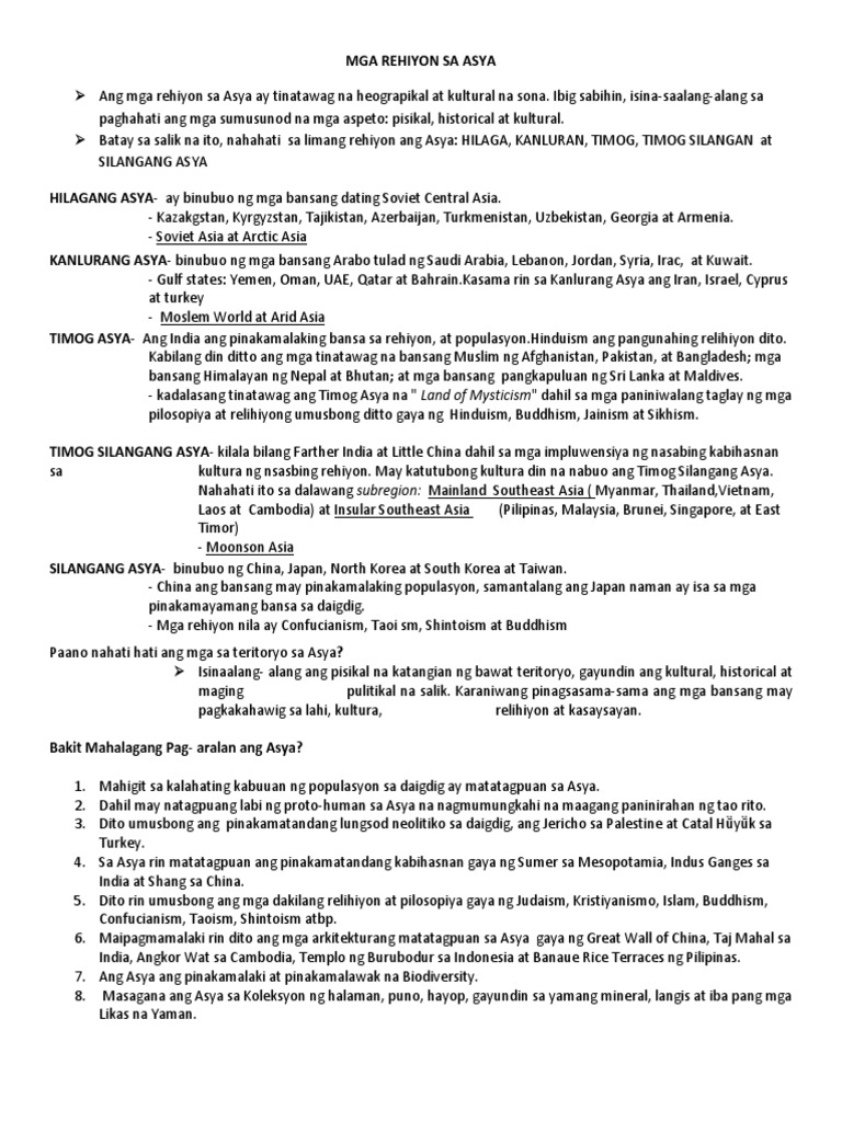 Ito ay binubuo ng limang rehiyon na tinatawag na Kanlurang Asya Hilagang Asya Timog Asya Silangang Asya at Timog-silangang Asya. Ang Himalayas ay tanyag sa buong mundo dahil sa haba nitong umaabot sa 1500 milya. Ang Asya ang may pinakamalaking bahagdan ng populasyon at lawak sakop nito ang halos 30 ng kabuuang lupa at 87 ng mundo.