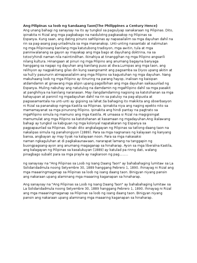 Ihinayag ni Rizal ang mga maaaringmaganap sa Pilipinas sa loob ng isang daang taon. Ang Pilipinas Sa Loob Ng Isang Daang Taon. Ang Pagpapatawad sa Konseptong Filipino Kapag ang Pagpatawad ang narinig ng isang tao o maging itoy isang punto ng pag aaral para sa nakakarami ang karaniwang naiisip ay isang konsepto ng Relihiyon.