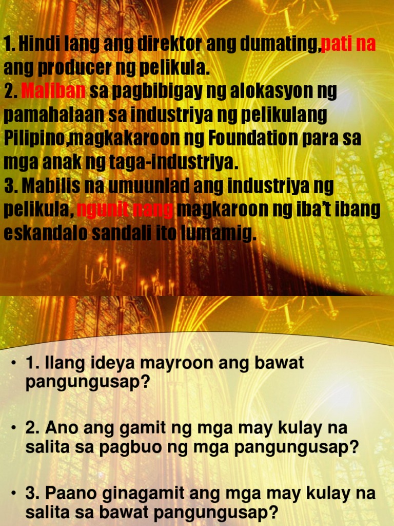 Magpaliwanag sa pagbibigay-halimbawa sa mga gamit ng wika sa lipunan. Ito ang ginagamit ng manunulat o naglalarawan upang magkaroon ng mas maayos at mas malinaw na daloy ng kaisipan sa isang teksto. Ano ang gamit ng mga may kulay na salita sa pagbuo ng mga pangungusap.