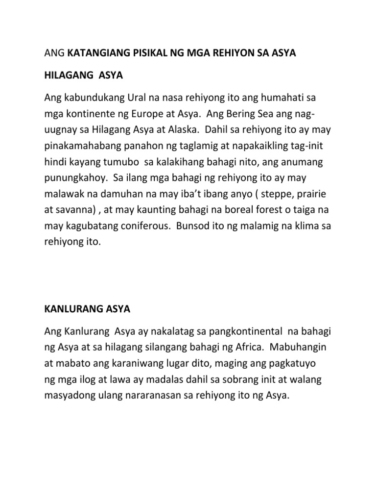 Pag-aaral ng mga katangiang pisikal kinaroroonan hugis sukatanyo. Katangiang Pisikal Ng Asya. Katangiang Pisikal Ng Mga Rehiyon Sa Asya - Free download as Powerpoint Presentation ppt pptx PDF File pdf Text File txt or view presentation slides online.