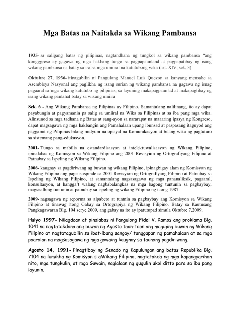 1987 Artikulo 14 seksyon 6 - 7 ng. Ipinahayag pa ring ituturo ang Wikang Pambansa sa mga paaralan sa buong Pilipinas na nagsimula noong Hunyo 19 1940. Start studying Mga Batas tungkol sa Wikang Pambansa.