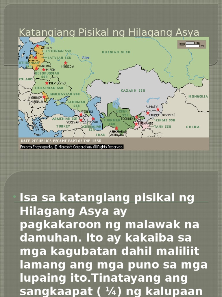 Isa sa katangiang pisikal ng Hilagang Asya ay pagkakaroon ng malawak na damuhan. ANG KATANGIANG PISIKAL NG MGA REHIYON SA ASYA HILAGANG ASYA Ang kabundukang Ural na nasa rehiyong ito ang humahati sa mga kontinente ng Europe at Asya. May sukat ng 44579000 square kilometers 17212000 sq mi.
